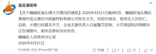 晚些时候,江苏省连云港市赣榆区人民政府办公室发布“关于赣榆区城头镇火灾情况的通报”。通报称,4月21日晚9时许,赣榆区城头镇后黄墩村连云港宏兴研磨材料有限公司发生火灾。经初步核实,现场无人员伤亡。目前,火情已经基本扑灭,企业主要负责人已被警方控制,火灾原因和详细情况正在调查中,相关信息将及时发布。